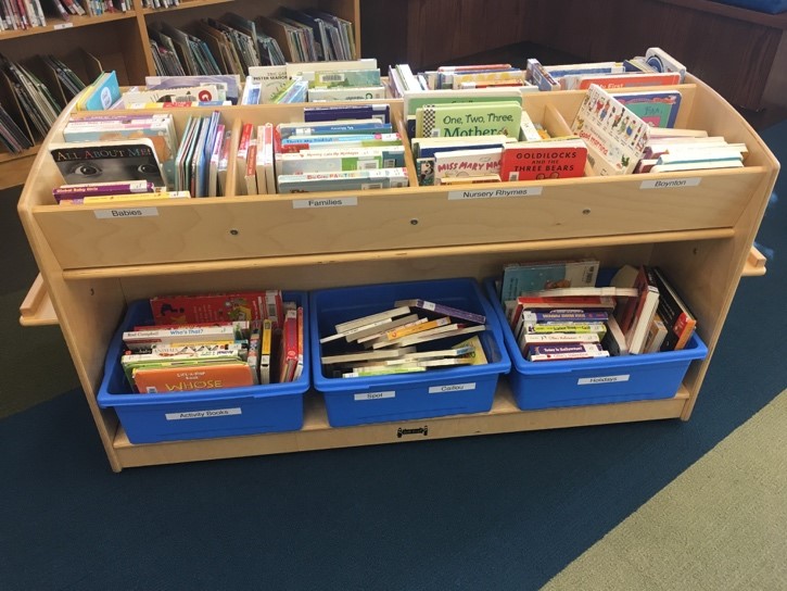 Instead, most agree that it is most efficient to use bins, organized by topic and to put the bins in areas of the room that will facilitate easy access. Some like the bins on shelves or movable tables around their common meeting area. Other teachers like to put the bins in different areas of the room where there is a nearby nook or area where the students can sit and read.  Sometimes it is possible to purchase a special book bin table, ideally on wheels that can be locked.