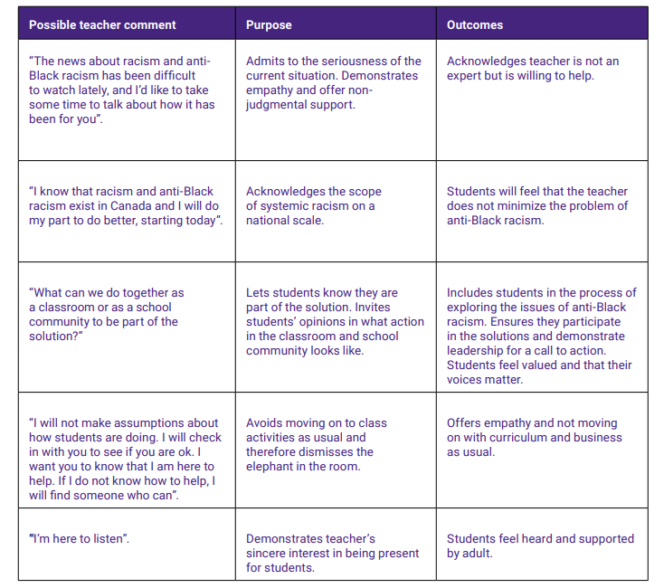 When done in a thoughtful, informed and intentional way, engaging students in discussions about anti-Black racism acknowledges and addresses systemic racial injustice. This can help a school community begin to move forward toward greater understanding, mutual support and, ultimately, healing.